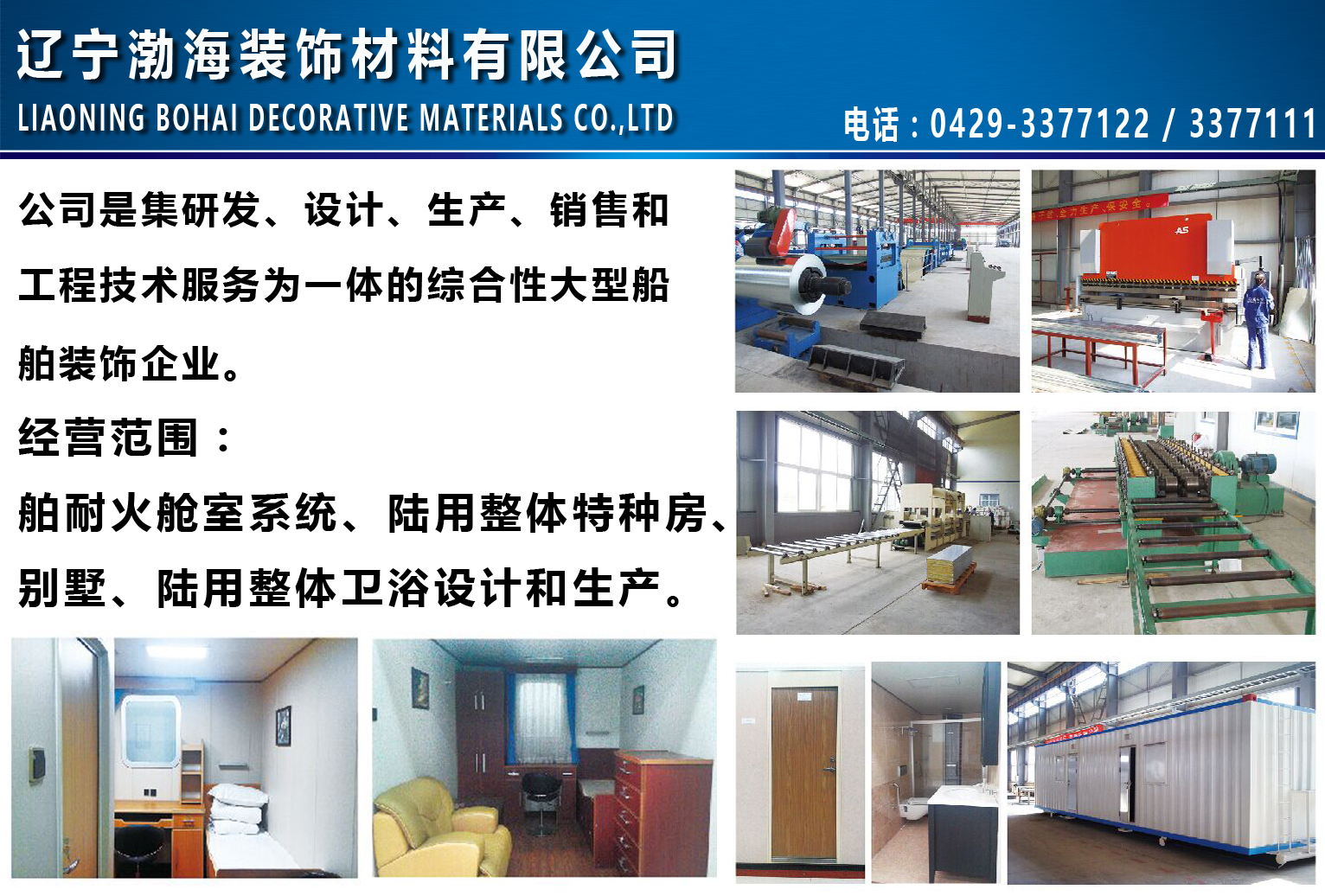 遼寧渤海裝飾材料有限公司是集研發(fā)、設(shè)計、生產(chǎn)、銷售和工程技術(shù)服務(wù)為一體的綜合性大型船舶裝飾企業(yè)??商峁┐澳突鹋撌蚁到y(tǒng)、陸用整體特種房、別墅、陸用整體衛(wèi)浴設(shè)計和生產(chǎn)。公司產(chǎn)品已取得了挪威船級社、英國勞氏船級社、美國船級社、德國船級社、法國船級社、韓國船級社、中國船級社以及歐盟船級社等多個主要船級社的產(chǎn)品認(rèn)可證書。遼寧渤海裝飾材料有限公司坐落于遼寧省葫蘆島市北港經(jīng)濟開發(fā)區(qū),是我國北方首家生產(chǎn)船舶金屬復(fù)合巖棉板防火門衛(wèi)生單元等耐火艙室內(nèi)相關(guān)裝飾材料的專業(yè)制造公司,其產(chǎn)品主要用于船舶內(nèi)裝飾工程和陸地醫(yī)藥實驗室等超潔凈車間工程船用巖棉板生產(chǎn)能力達到每年60萬平方米,船用防火門年生產(chǎn)能力,每年3000套,船用衛(wèi)生單元生產(chǎn)能力每年500套,目前相關(guān)產(chǎn)品已取得了包括挪威船級社,英國勞氏船級社美國船級社德國船級社,法國船級社,韓國船級社,中國船級社以及歐盟等多家船級社的產(chǎn)品認(rèn)可,主要生產(chǎn)設(shè)備和生產(chǎn)線有鋼板開卷機輥壓成型機板切割機夾芯板條切割機貼塑處理生產(chǎn)線,噴膠粘聯(lián)固化生產(chǎn)線,防火門生產(chǎn)線衛(wèi)生單元生產(chǎn)線,可滿足各類船舶裝飾及陸地相關(guān)工程的施工需求。