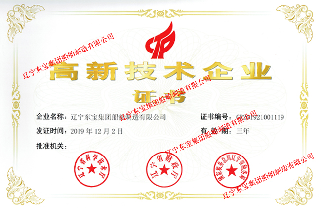 liaoning east treasure group subsidiaries in liaoning bohai anti-corrosion engineering co., LTD., east group of ship manufacturing co., LTD received science and technology department of liaoning province, liaoning province, departments, the state administration of taxation, tax bureau, liaoning province joint "high-tech enterprise certificate", issued by the above two companies since 2013, has now won six consecutive years "national hi-tech enterprise" honorary title.