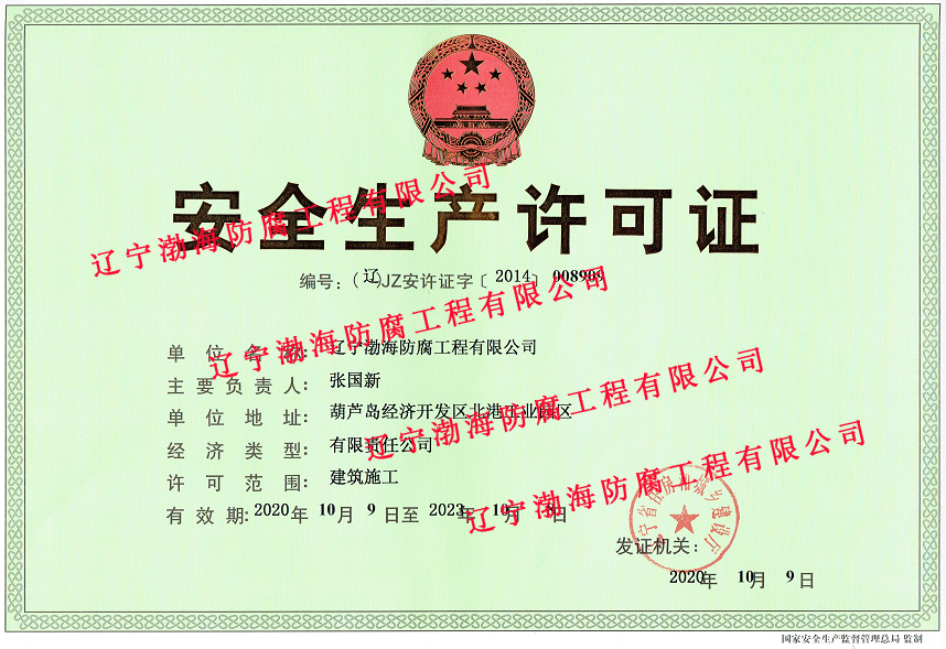 【渤海防腐】公司順利完成《安全生產許可證》延期換證工作